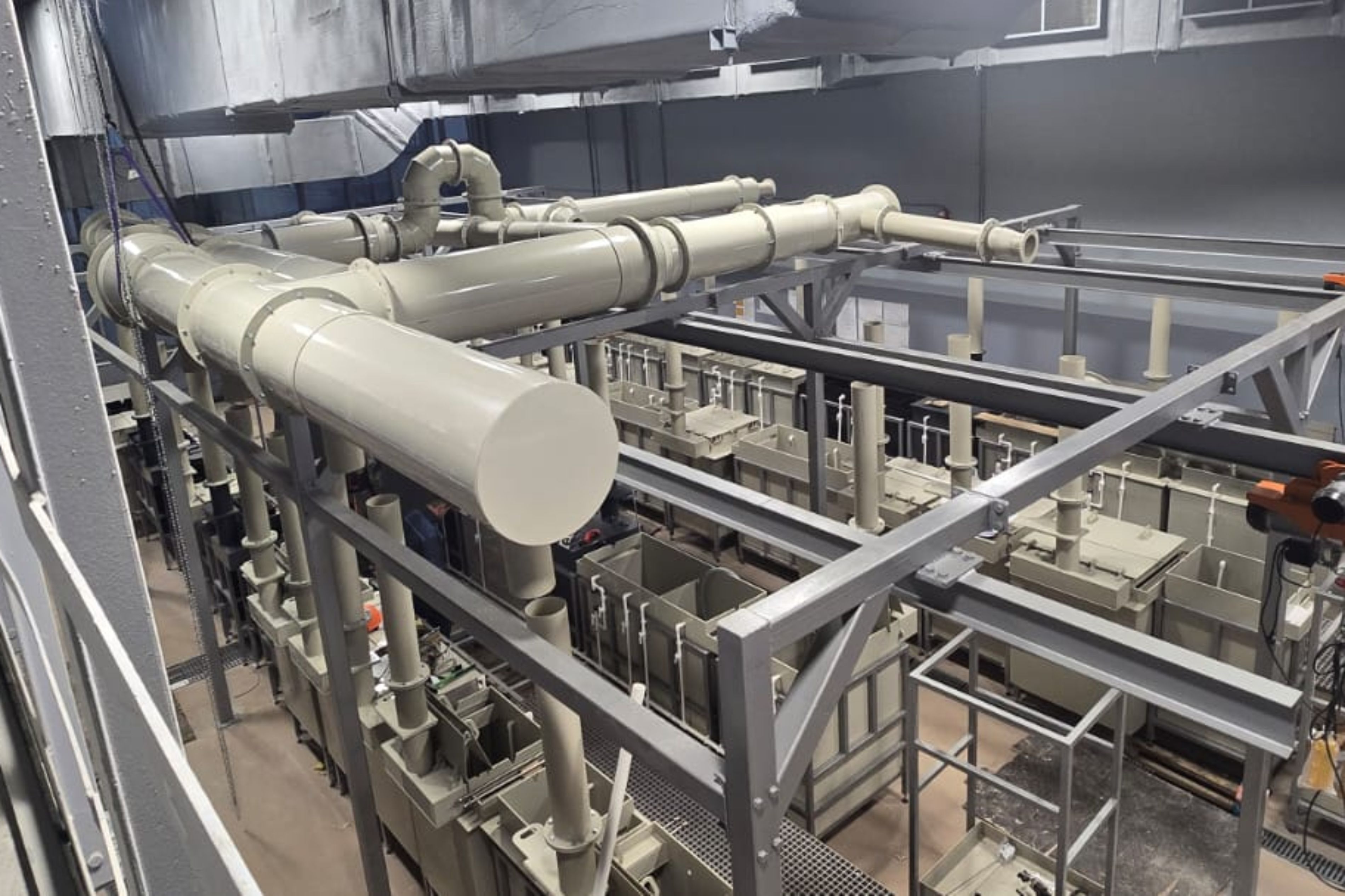 В реализации проекта задействованы два наших производства — в Новосибирске и Москве; старт был дан в начале 2025 года, и за прошедшее время уже выполнен монтаж основного объёма элементов промышленной вентиляции и водоподготовки, а системы водоочистки приближаются к финальной стадии готовности; в составе гальванических линий будет функционировать более 50 гальванических ванн.